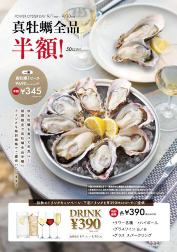 対象店舗にて、新鮮な真牡蠣を全品半額でご提供いたします。