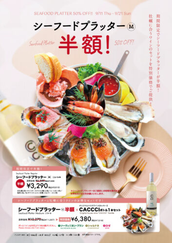 シーフードプラッター(Mサイズ)半額+「カッキー」ボトルワイン1本