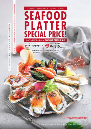牡蠣と魚介をたっぷり盛り込んだオイスターバー特製の「シーフードプラッター(Mサイズ)」を、期間限定で30OFFの特別価格にてご提供いたします!