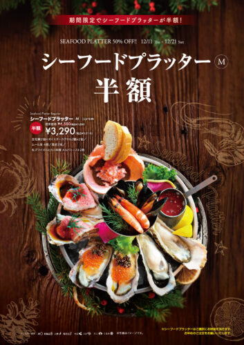 大好評いただいております、牡蠣と魚介をたっぷり盛り込んだオイスターバー特製の「シーフードプラッター(Mサイズ)」、12/11~12/21の期間限定で半額にてご提供いたします!